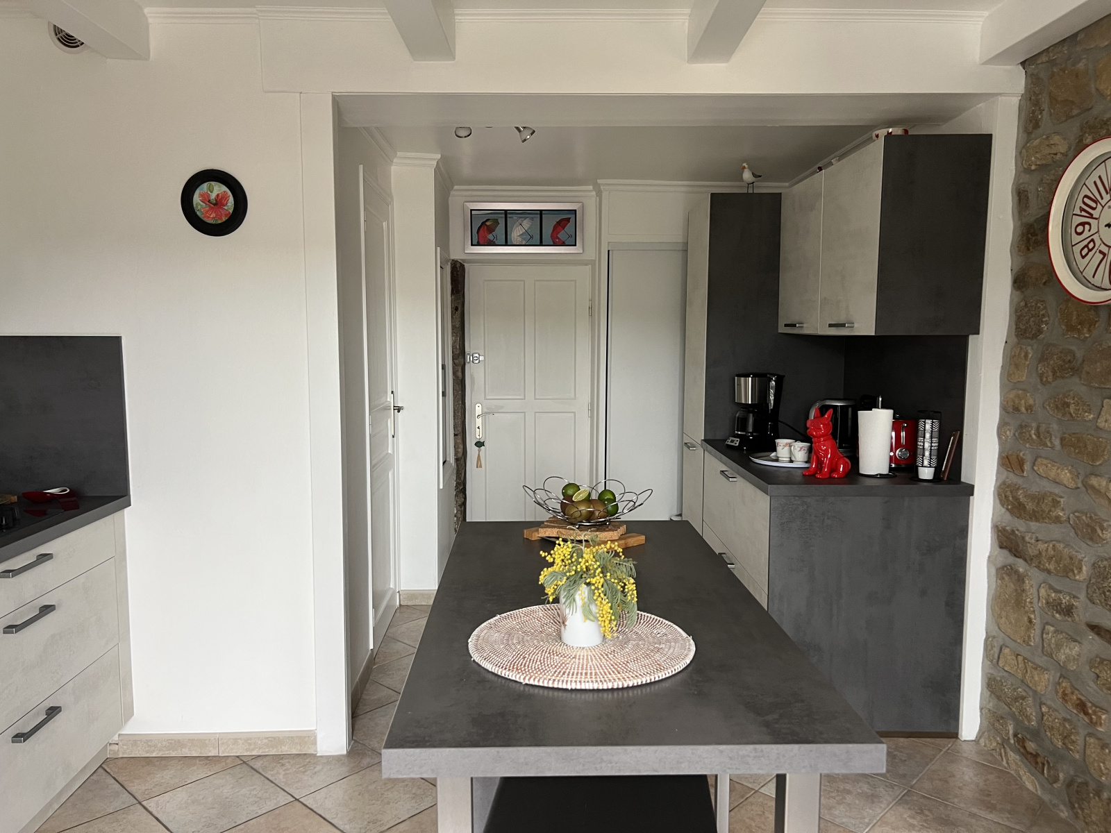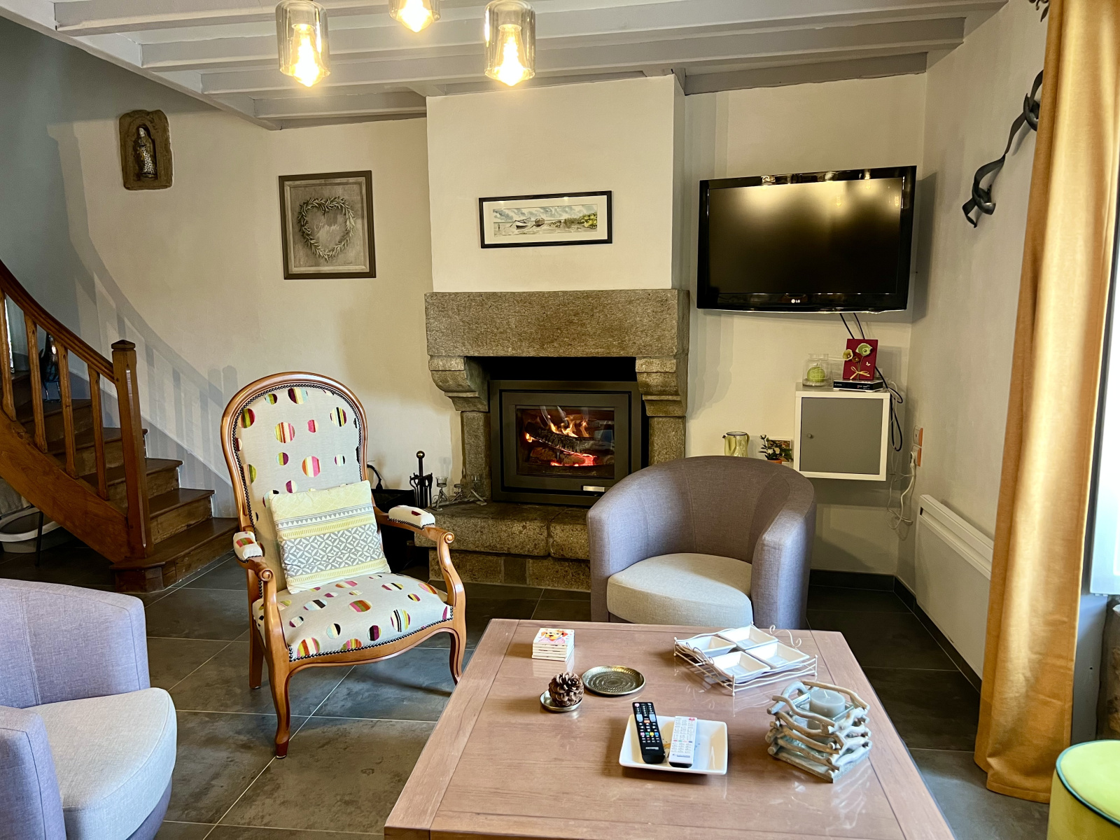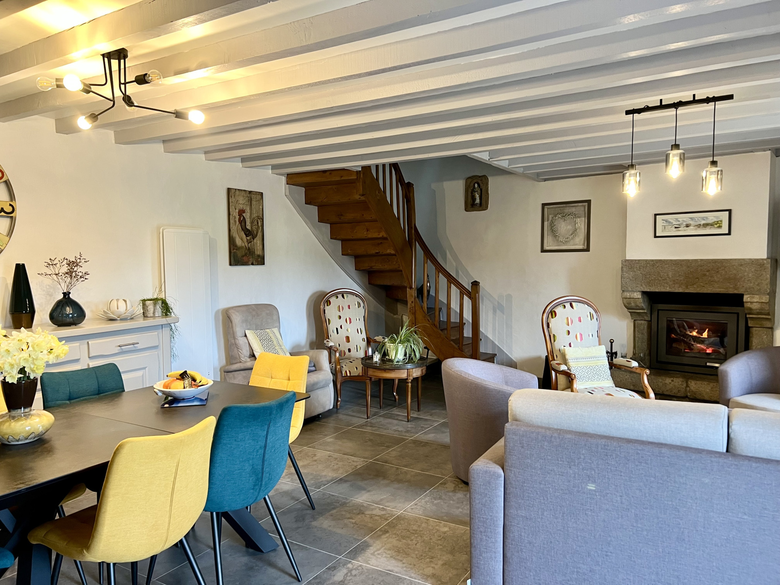 Au rez-de-chaussée : une jolie pièce de vie de 36 m2 environ avec cheminée insert, une cuisine aménagée et équipée, une salle d'eau avec WC, placards, arrière cuisine, et atelier ouvrant sur courette.